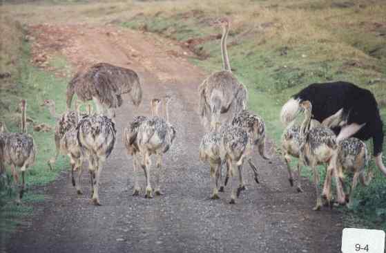 Here is a family of ostriches. The dark one is a male, and the other two large birds are females. The male mates with all the females in his territory. The females incubate the eggs during the day, and at night, the male takes over incubation while the females go out for food. These chicks are a few weeks old. This photo was taken in Ngorongoro Crater within the Ngorongoro Conservation Area in Tanzania. |